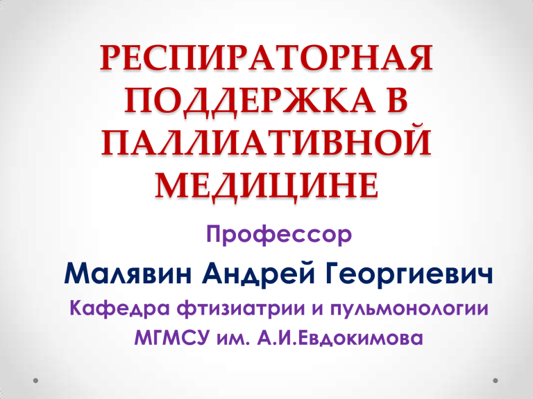 РЕСПИРАТОРНАЯ ПОДДЕРЖКА В ПАЛЛИАТИВНОЙ МЕДИЦИНЕ Профессор Малявин Андрей Георгиевич Кафедра фтизиатрии и пульмонологии МГМСУ им. А.И.Евдокимова КОМПОНЕНТЫ РЕСПИРАТОРНОЙ ПОДДЕРЖКИ • Неинвазивная вентиляция легких (СРАР, autoCPAP, BiPAP, интрапульмональная перкуссионная вентиляция легких, системы “Life support”) • Инвазивная вентиляция легких • Откашливатели (ИПВЛ, экстрапульмональная перкуссия (виброжилеты), Соugh Assist) • Компрессионные небулайзеры и mesh-ингаляторы • PEP- тренажеры (Flutter, Acapella, Aerobika, Lung Flute, насадки на небулайзеры) • Увлажнители • Малопоточные оксигенаторы • Отсосы • Бронхоальвеолярный лаваж ОПРЕДЕЛЕНИЕ ПОТРЕБНОСТИ В РЕСПИРАТОРНОЙ ПОДДЕРЖКЕ ОСТРАЯ ИЛИ ХРОНИЧЕСКАЯ ДЫХАТЕЛЬНАЯ НЕДОСТАТОЧНОСТЬ • Выраженная бронхиальная обструкция (бронхоспазм, • • • аспирация, бронхиальная гиперсекреция, формирование воздушной ловушки – экспираторного закрытия дыхательных путей) Нарушение работы дыхательного центра (выраженная интоксикация, ОСН, отек мозга) Выраженные рестриктивные нарушения (резекция легкого, карциноматоз легких, интерстициальные заболевания легких) Нарушение биомеханики дыхания (паралич диафрагмы, нейромышечные заболевания, дорсопатия, пневмотракс, плеврит) • Нарушение вентиляционно-перфузионных соотношений (ТЭЛА, острый респираторный дистресс-синдром, отек легких при правожелудочковой сердечной недостаточности) ОПРЕДЕЛЕНИЕ ПОТРЕБНОСТИ В РЕСПИРАТОРНОЙ ПОДДЕРЖКЕ ОДН ХДН ДИАГНОСТИКА И : • Клинические признаки • Спирография с определением кривой «поток-объем» • Боди-плетизмография • Пульсоксиметрия • Лабораторная диагностика (определение газового состава и КЩС крови, коагулограмма, D-димер, СРБ и др.) • ЭКГ • ЭхоКГ • Лучевая диагностика • УЗИ органов грудной клетки • Бронхоскопия НЕИНВАЗИВНАЯ ВЕНТИЛЯЦИЯ ЛЕГКИХ • CPAP, autoCPAP • BiPAP • ИПВЛ • Life support КЛИНИКО-ЛАБОРАТОРНЫЕ КРИТЕРИИ для применения неинвазивной респираторной поддержки • одышка; • диспноэ; • участие в акте дыхания вспомогательной мускулатуры; • тахикардия; • артериальная гипертензия (гипотензия); • цианоз; • гипоксемия; • гипокапния (на ранней стадии паренхиматозной ОДН); • гиперкапния; • респираторный алкалоз (на ранней стадии паренхиматозной ОДН); • респираторный (иногда смешанный) ацидоз. ПРОТИВОПОКАЗАНИЯ ДЛЯ ПРИМЕНЕНИЯ НЕИНВАЗИВНОЙ РЕСПИРАТОРНОЙ ПОДДЕРЖКИ • • • • • • • • • • • ОСТАНОВКА ДЫХАНИЯ; НЕСТАБИЛЬНАЯ ГЕМОДИНАМИКА (ГИПОТЕНЗИЯ, ИШЕМИЯ ИЛИ ИНФАРКТ МИОКАРДА, ЖИЗНЕУГРОЖАЮЩАЯ АРИТМИЯ, НЕКОНТРОЛИРУЕМАЯ АРТЕРИАЛЬНАЯ ГИПЕРТЕНЗИЯ); НЕВОЗМОЖНОСТЬ ОБЕСПЕЧИТЬ ЗАЩИТУ ДЫХАТЕЛЬНЫХ ПУТЕЙ (НАРУШЕНИЕ КАШЛЯ И ГЛОТАНИЯ) И ВЫСОКИЙ РИСК АСПИРАЦИИ; ИЗБЫТОЧНАЯ БРОНХИАЛЬНАЯ СЕКРЕЦИЯ; ПРИЗНАКИ НАРУШЕНИЯ СОЗНАНИЯ (ВОЗБУЖДЕНИЕ ИЛИ УГНЕТЕНИЕ СОЗНАНИЯ), НЕСПОСОБНОСТЬ ПАЦИЕНТА К СОТРУДНИЧЕСТВУ С МЕДИЦИНСКИМ ПЕРСОНАЛОМ; ЛИЦЕВАЯ ТРАВМА, ОЖОГИ, АНАТОМИЧЕСКИЕ НАРУШЕНИЯ, ПРЕПЯТСТВУЮЩИЕ УСТАНОВКЕ МАСКИ, ВЫРАЖЕННОЕ ОЖИРЕНИЕ; НЕСПОСОБНОСТЬ ПАЦИЕНТА УБРАТЬ МАСКУ С ЛИЦА В СЛУЧАЕ РВОТЫ; АКТИВНОЕ КРОВОТЕЧЕНИЕ ИЗ ЖЕЛУДОЧНО-КИШЕЧНОГО ТРАКТА; ОБСТРУКЦИЯ ВЕРХНИХ ДЫХАТЕЛЬНЫХ ПУТЕЙ; ДИСКОМФОРТ ОТ МАСКИ; ОПЕРАЦИИ НА ВЕРХНИХ ДЫХАТЕЛЬНЫХ ПУТЯХ. КРИТЕРИИ НАЗНАЧЕНИЯ ИНВАЗИВНОЙ ВЕНТИЛЯЦИИ ЛЕГКИХ • Отсутствие спонтанного дыхания • рН крови ≤7,25 • Неэффективность или невозможность проведения НИВЛ КРИТЕРИИ НАЗНАЧЕНИЯ ИНТРАПУЛЬМОНАЛЬНОЙ ПЕРКУССИОННОЙ ВЕНТ