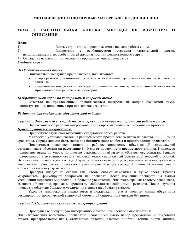 МЕТОДИЧЕСКИЕ И ОЦЕНОЧНЫЕ МАТЕРИ АЛЫ ПО ДИСЦИПЛИНЕ ТЕМА РАСТИТЕЛЬНАЯ ОПИСАНИЯ 1: КЛЕТКА. МЕТОДЫ ЕЕ ИЗУЧЕНИЯ Цели: 1) Знать устройство микроскопа, иметь навыки работы с ним. 2) Знакомство с особенностями строения растительной использованием этих особенностей для диагностики лекарственного сырья. 3) Овладение навыками приготовления временных микропрепаратов Учебная карта: И клетки, А) Организационная часть. Внимательно выслушав преподавателя, познакомьте: • с программой дисциплины (кратко) и основными требованиями по подготовке к занятиям; • с правилами поведения на кафедре и правилами охраны труда и техники безопасности при выполнении работы в лаборатории. Б) Фронтальный опрос по контрольным вопросам темы. Ответьте на предложенный преподавателем контрольный вопрос изучаемой темы, используя знания, полученные при подготовке к занятию. В) Задания для учебно-исследовательской работы Задание 1: Знакомство с устройством микроскопа и основными приемами работы с ним. Познакомиться с работой микроскопа, т.е. на практике найти все механизмы прибора. Правила работы с микроскопом. Предложите студентам выполнить следующий объём работы: Микроскоп устанавливается на рабочем месте против левого плеча на расстоянии 2-3 см от края стола. Справа должно быть место для ботанического альбома и приготовления препаратов. Поворачивая револьвер, ставят в рабочее положение объектив 8х, кремальерой устанавливают объектив на расстояние 8-10 мм от поверхности предметного столика. Конденсор поднимают вверх до упора, полностью открывают диафрагму и убирают светофильтр. Зеркало поворачивают к источнику света (лампочка, окно, специальный осветитель) плоской стороной. Вынув окуляр и наблюдая выходной зрачок объектива через тубус, вращают зеркало, добиваясь того, чтобы пучок света полностью и равномерно освещал выходной зрачок объектива, после этого вставляют окуляр на место. Препарат кладут на столик так, чтобы объект находился в пучке света. Вращая макровинтом, фокусируют микроскоп на препарат. После изучения препарата на малом увеличении переводят микроскоп на большое увеличение. Для этого, вращая головку револьвера, сменяют объектив и, вращая микровинтом, добиваются необходимой резкости. После изучения препарата объектив большого увеличения меняют на объектив малого. Уход за микроскопом заключается в поддержании его в чистоте, линзы объективов регулярно протирают мягкой тряпочкой смоченной спиртом или чистым бензином. Задание 2: Изготовление временных микропрепаратов. Прослушайте следующую информацию и выполните необходимые действия: Для изготовления временных препаратов необходимо иметь набор предметных и покровных стекол, препаровальные иглы, стеклянные палочки, глазные пипетки, тонкие кисти, пинцет, фильтровальную бумагу. Задание 3: Знакомство с правилами заполнения протокола лабораторного занятия. Прослушайте следующую информацию и выполните необходимые действия Ботанический альбом и ботанический рисунок: Зарисовка препаратов или самих растений или отдельных частей играет большую роль в изучении материала на практических занятиях. Грамотный анатомический и ботанический рисунок это схема большей или меньшей точности и выполняется двумя пространственными средствами - линией и точкой. Рисунок должен быть достаточно крупным