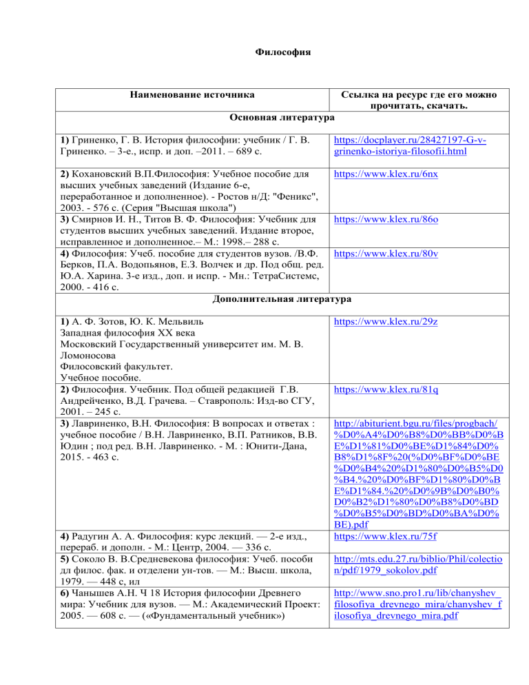Философия Наименование источника Ссылка на ресурс где его можно прочитать, скачать. Основная литература 1) Гриненко, Г. В. История философии: учебник / Г. В. Гриненко. – 3-е., испр. и доп. –2011. – 689 с. https://docplayer.ru/28427197-G-vgrinenko-istoriya-filosofii.html 2) Кохановский В.П.Философия: Учебное пособие для https://www.klex.ru/6nx высших учебных заведений (Издание 6-е, переработанное и дополненное). - Ростов н/Д: "Феникс", 2003. - 576 с. (Серия "Высшая школа") 3) Смирнов И. Н., Титов В. Ф. Философия: Учебник для https://www.klex.ru/86o студентов высших учебных заведений. Издание второе, исправленное и дополненное.– М.: 1998.– 288 с. 4) Философия: Учеб. пособие для студентов вузов. /В.Ф. https://www.klex.ru/80v Берков, П.А. Водопьянов, Е.З. Волчек и др. Под общ. ред. Ю.А. Харина. 3-е изд., доп. и испр. - Мн.: ТетраСистемс, 2000. - 416 с. Дополнительная литература 1) А. Ф. Зотов, Ю. К. Мельвиль Западная философия XX века Московский Государственный университет им. М. В. Ломоносова Филосовский факультет. Учебное пособие. 2) Философия. Учебник. Под общей редакцией Г.В. Андрейченко, В.Д. Грачева. – Ставрополь: Изд-во СГУ, 2001. – 245 с. 3) Лавриненко, В.Н. Философия: В вопросах и ответах : учебное пособие / В.Н. Лавриненко, В.П. Ратников, В.В. Юдин ; под ред. В.Н. Лавриненко. - М. : Юнити-Дана, 2015. - 463 с. 4) Радугин А. А. Философия: курс лекций. — 2-е изд., перераб. и дополн. - М.: Центр, 2004. — 336 с. 5) Соколо В. В.Средневекова философия: Учеб. пособи дл филос. фак. и отделени ун-тов. — М.: Высш. школа, 1979. — 448 с, ил 6) Чанышев А.Н. Ч 18 История философии Древнего мира: Учебник для вузов. — М.: Академический Проект: 2005. — 608 с. — («Фундаментальный учебник») https://www.klex.ru/29z https://www.klex.ru/81q http://abiturient.bgu.ru/files/progbach/ %D0%A4%D0%B8%D0%BB%D0%B E%D1%81%D0%BE%D1%84%D0% B8%D1%8F%20(%D0%BF%D0%BE %D0%B4%20%D1%80%D0%B5%D0 %B4.%20%D0%BF%D1%80%D0%B E%D1%84.%20%D0%9B%D0%B0% D0%B2%D1%80%D0%B8%D0%BD %D0%B5%D0%BD%D0%BA%D0% BE).pdf https://www.klex.ru/75f http://mts.edu.27.ru/biblio/Phil/colectio n/pdf/1979_sokolov.pdf http://www.sno.pro1.ru/lib/chanyshev_ filosofiya_drevnego_mira/chanyshev_f ilosofiya_drevnego_mira.pdf 7) Ясперс Карл — «Введение в философию» Пер. с нем. Под ред. А. А. Михайлова Мн.: Пропилеи, 2000. - 192 с. https://www.klex.ru/b7t