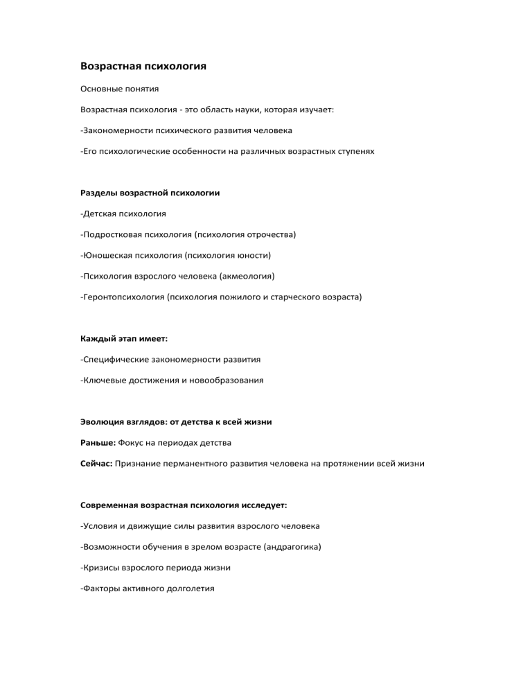 Возрастная психология Основные понятия Возрастная психология - это область науки, которая изучает: -Закономерности психического развития человека -Его психологические особенности на различных возрастных ступенях Разделы возрастной психологии -Детская психология -Подростковая психология (психология отрочества) -Юношеская психология (психология юности) -Психология взрослого человека (акмеология) -Геронтопсихология (психология пожилого и старческого возраста) Каждый этап имеет: -Специфические закономерности развития -Ключевые достижения и новообразования Эволюция взглядов: от детства к всей жизни Раньше: Фокус на периодах детства Сейчас: Признание перманентного развития человека на протяжении всей жизни Современная возрастная психология исследует: -Условия и движущие силы развития взрослого человека -Возможности обучения в зрелом возрасте (андрагогика) -Кризисы взрослого периода жизни -Факторы активного долголетия Возратсные особенности развития -Это типические черты, характерные для конкретного этапа жизни, которые определяют основное направление развития Задачи возраастной психологии Теоретические задачи: Исследование и описание психической реальности на разных этапах жизни Создание периодизаций развития Изучение движущих сил, источников и механизмов психического развития на протяжении всего жизненного пути Практические задачи: Соотнесение эмпирических данных с теориями развития Определение нормы и отклонений в развитии -Норма - высшие возможные достижения для возраста -Отклонения анализируются с учетом условий и индивидуальных особенностей Возрастная диагностика, сопровождение и помощь Ключевое понятие: Зона ближайшего развития (Л.С. Выготский) Ключевые детерминанты развития Механизмы психического развития -Социальная ситуация развития: Определяет: Формы пути развития, виды деятельности, приобретение новых психических свойств -Ведущий тип деятельности: Ключевые характеристики: -Не та, которой уделяется больше ыремени, а та, которая определяет главные изменения в психике -Специфична для каждой стадии развития -Смена ведущей деятельности - знак перехода на новую стадию -Является критерием диагностики этапа развития -По А. Н. Леонтьеву: именно в процессе ведущей деятельности возникают и тренируются новые психические функции Кризисы развития и психологические новообразания ! КРИЗИС РАЗВИТИЯ Это переломный момент в нормальном ходе психического развития, возникающий на стыке двух возрастных периодов. Суть кризиса: Перестройка внутреннего переживания и отношения к среде. Изменение потребностей и мотивов, направляющих поведение. Кризис - не отклонение, а ключевой элемент механизма развития. Источник кризиса Противоречие между: растущими физическими и психическими возможностями ребенка и устаревшими формами взаимоотношений с окружающими и видами деятельности Роль в развитии: Знаменует завершение одного возрастного периода. Запускает переход к следующему этапу развития. Служит двигателем для качественных ПСИХОЛОГИЧЕСКИЕ НОВООБРАЗОВАНИЯ Это качественно новые психические и социальные изменения, возникающие на определенной ступени развития и определяющие сознание ребенка. Их характеристики: Являются главным результатом возрастного этапа: Перестраивают всю личность ребенка на новой ос