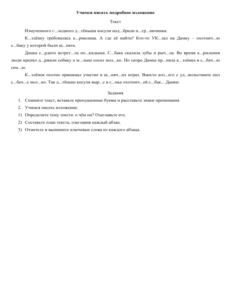 Учимся писать подробное изложение Текст Измученного г...лодного д...тёныша косули под...брали п...гр...ничники. К...злёнку требовалась к...рмилица. А где её найти? Кто-то УК...зал на Дамку – охотнич...ю с...баку у которой были щ...нята. Дамка с...рдито встрет...ла по...кидыша. С...бака скалила зубы и рыч...ла. Во время к...рмления люди крепко д...ржали собаку а м...лыш сосал мол...ко. Но скоро Дамка пр...няла к...злёнка в с...бач...ю сем...ю. К...злёнок охотно принимал участие в щ...няч...их играх. Вместо коз...его с уд...вольствием пил с...бач...е мол...ко. Так д...тёныш косули выр...с в с...мье охотнич...ей с...бак... Дамки. Задания 1. Спишите текст, вставьте пропущенные буквы и расставьте знаки препинания. 2. Учимся писать изложение. 1) Определите тему текста: о чём он? Озаглавьте его. 2) Составьте план текста, озаглавив каждый абзац. 3) Отметьте и выпишите ключевые слова из каждого абзаца.