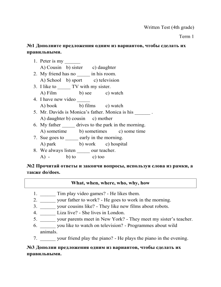 Written Test (4th grade) Term 1 №1 Дополните предложения одним из вариантов, чтобы сделать их правильными. 1. Peter is my ______ A) Cousin b) sister c) daughter 2. My friend has no _____ in his room. A) School b) sport c) television 3. I like to _____ TV with my sister. A) Film b) see c) watch 4. I have new video _____ A) book b) films c) watch 5. Mr. Davids is Monica’s father. Monica is his ______ . A) daughter b) cousin c) mother 6. My father _____ drives to the park in the morning. A) sometime b) sometimes c) some time 7. Sue goes to _____ early in the morning. A) park b) work c) hospital 8. We always listen _____ our teacher. A) b) to c) too №2 Прочитай ответы и закончи вопросы, используя слова из рамки, а также do/does. What, when, where, who, why, how 1. ______ Tim play video games? - He likes them. 2. ______ your father to work? - He goes to work in the morning. 3. ______ your cousins like? - They like new films about robots. 4. ______ Liza live? - She lives in London. 5. ______ your parents meet in New York? - They meet my sister’s teacher. 6. ______ you like to watch on television? - Programmes about wild animals. 7. ______ your friend play the piano? - He plays the piano in the evening. №3 Дополни предложения одним из вариантов, чтобы сделать их правильными. 1. They are ______ toys. a) Children b) children’s c) childrens’ 2. It is ______ school bag. a) Ann’s b) Ann’ c)Anns’ 3. This is my _____ house. a) Grandparent's b) grandparents’ c) grandparents 4. Bob is ______ brother. a) Max’s b) Max c) Maxs’ 5. Kate is my _______ daughter. a) Cousin' b) cousins c) cousin’s №4 Вставьте пропущенные буквы в слова. 1. My co_sin always w_tches inter_sting films. 2. Wh_n does Matt play vid_o games? 3. Her d_ughter plays the pi_no in the evening. 4. What progra_mes does your friend watch on t_levision? 5. My gr_ndparents don’t work.