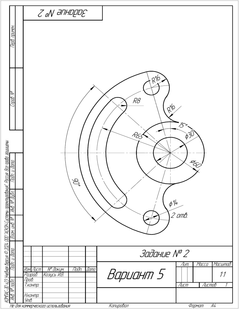 2 Перв. примен. Задание Справ. R16 R8 R16 15Å Ç30 0 Ç6 90Å КОМПАС-3D v23 Учебная версия © 2024 ООО "АСКОН-Системы проектирования", Россия. Все права защищены. Инв. подл. Подп. и дата Взам. инв. Инв. дубл. Подп. и дата R65 Ç14 2 отв. Задание 2 Лит. Изм. Лист докум. Разраб. Козусь И.В. Пров. Т.контр. Н.контр. Утв. Не для коммерческого использования Подп. Дата Вариант 5 Копировал Масса Масштаб 1:1 Лист Листов Формат A4 1