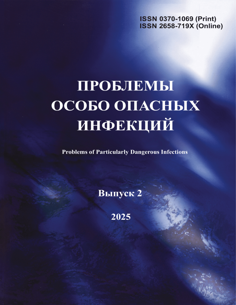 Подписной индекс в каталоге «Пресса России» – 29448 Стоимость подписки – от 1566,0 руб. Журнал зарегистрирован в Федеральной службе по надзору в сфере связи, информационных технологий и массовых коммуникаций Свидетельство ПИ № ФС77-74153 от 29 октября 2018 г. Журнал «Проблемы особо опасных инфекций» является рецензируемым изданием Все рукописи проходят проверку системой «Антиплагиат» Журнал «Проблемы особо опасных инфекций» индексируется в РИНЦ и Scopus Ответственность за достоверность информации, содержащейся в рекламных материалах, несут рекламодатели Адрес издателя и редакции: ФКУН Российский противочумный институт «Микроб» Роспотребнадзора 410005, Саратов, ул. Университетская, 46 E-mail: jour@microbe.ru Сайт: http://journal.microbe.ru Начальник редакционно-издательского отдела ФКУН Российский противочумный институт «Микроб» Роспотребнадзора Е.С. Герасимова Тел. (845-2) 51-82-22 Факс (845-2) 51-52-12 Редакторы: Е.Ю. Лашкова, В.В. Россошанская Технический редактор Т.К. Меркулова Перевод на английский A.П. Ножкиной, Т.Б. Караваевой Проблемы особо опасных инфекций. 2025. Вып. 2. 194 с. Подписано в печать 24.06..2025 Дата выхода в свет 27.06.2025 Формат 60×84 1/8 Бумага мелованная Печать офсетная Усл. печ. л. 22,6 Заказ № 3263-25 Журнал отпечатан в типографии ООО «Амирит». 410004, Саратов, ул. Чернышевского, д. 88, литер У Федеральное казенное учреждение науки «Российский научно-исследовательский противочумный институт «Микроб» Федеральной службы по надзору в сфере защиты прав потребителей и благополучия человека, 2025 ГЛ А В Н Ы Й Р Е Д А К Т О Р Кутырев В.В., докт. мед. наук, академик РАН (Саратов, Россия) РЕДАКЦИОННЫЙ СОВЕТ: Акимкин В.Г., докт. мед. наук, академик РАН (Москва, Россия) Балахонов С.В., докт. мед. наук, профессор (Иркутск, Россия) Бондарев В.П., докт. мед. наук, профессор (Москва, Россия) Борисевич C.В., докт. биол. наук, профессор, академик РАН (Сергиев Посад, Россия) Гинцбург А.Л., докт. мед. наук, академик РАН (Москва, Россия) Дятлов И.А., докт. мед. наук, академик РАН (Оболенск, Россия) Куличенко А.Н., докт. мед. наук, академик РАН (Ставрополь, Россия) Львов Д.К., докт. мед. наук, академик РАН (Москва, Россия) Малеев В.В., докт. мед. наук, академик РАН (Москва, Россия) Онищенко Г.Г., докт. мед. наук, академик РАН (Москва, Россия) Сергиев В.П., докт. мед. наук, академик РАН (Москва, Россия) Топорков А.В., докт. мед. наук (Волгоград, Россия) И Н О С Т РА Н Н Ы Е Ч Л Е Н Ы Р Е Д А К Ц И О Н Н О Г О С О В Е ТА : Абдикаримов С.Т., докт. мед. наук, доцент (Бишкек, Кыргызстан) Мотин В.Л., профессор (Галвестон, США) Титов Л.П., докт. мед. наук, профессор, член-корр. НАН Беларуси, иностранный член РАН (Минск, Беларусь) Цогбадрах Нямдорж, канд. мед. наук (Улаанбаатар, Монголия) Р Е Д А К Ц И О Н Н А Я КОЛ Л Е Г И Я: Альховский С.В., докт. биол. наук, член-корр. РАН (Москва, Россия) Андаев Е.И., докт. мед. наук (Иркутск, Россия) Бугоркова С.А., докт. мед. наук (Саратов, Россия) Гулий О.И., докт. биол. наук (Саратов, Россия) Ерошенко Г.А., докт. биол. наук (Саратов, Россия) Жарникова И.В., докт. биол. наук (Ставрополь, Россия) Карпунина Л.В., докт. биол. наук, профессор (Саратов, Россия) Кругликов В.Д., докт. мед. наук, с. н. с. (Ростов-на-Дону, Россия) Малецкая О.В., докт. мед. наук, профессор (Ставрополь, Россия) Микеров А.Н., докт. биол. наук (Саратов, Россия) Пеньевская Н.А., докт. мед. наук, доцент (Омск, Россия) Попов Н.В., докт. биол. наук, профессор (Саратов, Россия) Саяпина Л.В., докт. мед. наук (Москва, Россия) Смирно