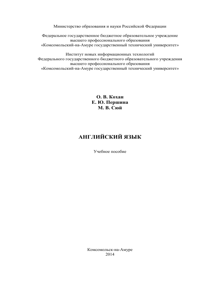 Министерство образования и науки Российской Федерации Федеральное государственное бюджетное образовательное учреждение высшего профессионального образования «Комсомольский-на-Амуре государственный технический университет» Институт новых информационных технологий Федерального государственного бюджетного образовательного учреждения высшего профессионального образования «Комсомольский-на-Амуре государственный технический университет» О. В. Кохан Е. Ю. Першина М. В. Сюй АНГЛИЙСКИЙ ЯЗЫК Учебное пособие Комсомольск-на-Амуре 2014 Кохан, О.В. Английский язык: учеб. пособие / О.В. Кохан, Е.Ю. Першина, М.В. Сюй. – Комсомольск-на-Амуре: ФГБОУ ВПО «КнАГТУ», 2014. – 186 с. Пособие способствует формированию, развитию и закреплению грамматических и лексических умений и навыков в изучении английского языка, подготовке студентов к самостоятельной учебной и научно-исследовательской работе на английском языке. Материалы пособия развивают и закрепляют у студентов умения и навыки применения разных видов чтения с извлечением информации из научной и научно-популярной литературы. Пособие включает в себя грамматические основы изучаемого языка; лексические основы чтения текстов страноведчесткого характера и профессиональноориентированных текстов на английском языке; контрольные работы. Предназначено для студентов очно-заочной и заочной форм обучения с использованием дистанционных технологий. © Федеральное государственное бюджетное образовательное учреждение высшего профессионального образования «Комсомольский-на-Амуре государственный технический университет», 2014 © Институт новых информационных технологий Федерального государственного бюджетного образовательного учреждения высшего профессионального образования «Комсомольский-на-Амуре государственный технический университет», 2014 3 ОГЛАВЛЕНИЕ ВВЕДЕНИЕ .......................................................................................................................................................... 6 ЧАСТЬ 1. ГРАММАТИЧЕСКИЙ КОММЕНТАРИЙ .................................................................................. 8 1. ИМЯ СУЩЕСТВИТЕЛЬНОЕ ................................................................................................................... 8 1.1. Число существительных ................................................................................................................... 8 Тенировочные упражнения ....................................................................................................................... 9 1.2. Падеж существительных .................................................................................................................. 9 Тренировочные упражнения ................................................................................................................... 11 1.3. Существительное в функции определения ................................................................................... 11 Тренировочные упражнения ................................................................................................................... 11 2. АРТИКЛЬ .................................................................................................................................................... 12 2.1. Неопределенный артикль ............................................................................................................... 12 2.2. Определенный артикль ................................................................................................................... 12 Тренировочные упражнения ................................................................................................................... 13 3. МЕСТОИМЕНИЕ .................................................................................................................................... 15 3.1. Личные местоимения ...................................................................................................................... 15 Тренировочные упражнения ................................................................................................................... 16 3.2. Притяжат