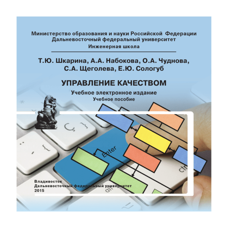 Ìèíèñòåðñòâî îáðàçîâàíèÿ è íàóêè Ðîññèéñêîé Ôåäåðàöèè Äàëüíåâîñòî÷íûé ôåäåðàëüíûé óíèâåðñèòåò Èíæåíåðíàÿ øêîëà Т.Ю. Шкарина, А.А. Набокова, О.А. Чуднова, С.А. Щеголева, Е.Ю. Сологуб УПРАВЛЕНИЕ КАЧЕСТВОМ Учебное электронное издание Учебное пособие Âëàäèâîñòîê Äàëüíåâîñòî÷íûé ôåäåðàëüíûé óíèâåðñèòåò 2015 Министерство образования и науки Российской Федерации Дальневосточный федеральный университет Инженерная школа Т.Ю. Шкарина, А.А. Набокова, О.А. Чуднова, С.А. Щеголева, Е.Ю. Сологуб УПРАВЛЕНИЕ КАЧЕСТВОМ Учебное электронное издание Учебное пособие Рекомендовано Дальневосточным региональным учебно-методическим центром в качестве учебного пособия для студентов направлений подготовки магистров 27.04.05 «Инноватика» и 27.04.02 «Управление качеством» вузов региона Владивосток Дальневосточный федеральный университет 2015 УДК 658.5(075.8) ББК 65.291.21я73 Ш66 Рецензенты: Г.П. Старкова, д.т.н., профессор, заместитель первого проректора по научной работе (Владивостокский государственный университет экономики и сервиса, Владивосток); Е.А. Любченко, к.ф.-м.н., доцент, старший научный сотрудник (Физический институт им. П.Н. Лебедева РАН, Москва). Авторы: Шкарина Татьяна Юрьевна, к.э.н., доцент кафедры инноватики, качества, стандартизации и сертификации Инженерной школы (Дальневосточный федеральный университет, Владивосток); Набокова Анастасия Александровна, к.т.н., доцент кафедры инноватики, качества, стандартизации и сертификации Инженерной школы (Дальневосточный федеральный университет, Владивосток); Чуднова Ольга Александровна, к.ф.-м.н., доцент кафедры инноватики, качества, стандартизации и сертификации Инженерной школы (Дальневосточный федеральный университет, Владивосток); Щеголева Светлана Анатольевна, к.ф.-м.н., доцент кафедры инноватики, качества, стандартизации и сертификации Инженерной школы (Дальневосточный федеральный университет, Владивосток); Сологуб Евгений Юрьевич, аспирант кафедры инноватики, качества, стандартизации и сертификации Инженерной школы (Дальневосточный федеральный университет, Владивосток). Шкарина Т.Ю., Набокова А.А., Чуднова О.А., Щеголева С.А., Сологуб Е.Ю. Управление качеством: учебное пособие [Электронный ресурс] / Инженерная школа ДВФУ. – Электрон. дан. – Владивосток: Дальневост. федерал. ун-т, 2015. [345 с.]. – 1 CD. – Систем. требования: процессор с частотой 1,3 ГГц (Intel, AMD); оперативная память 256 МБ, Windows (XP; Vista; 7 и т.п.); Acrobat Reader, Foxit Reader либо любой другой их аналог. ISBN 978-5-7444-3510-3 В учебном пособии рассматриваются вопросы управления качеством через систематизацию основных положений отечественных и зарубежных концепций; история развития управления качеством, научные и практические подходы к управлению качеством и теоретические и практические аспекты внедрения процессного подхода и применения средств и методов управления качеством. Предназначено для магистров направления подготовки 27.04.05 «Инноватика» и 27.04.02. «Управление качеством», а также других направлений подготовки всех форм обучения, изучающих дисциплину управление качеством. Ключевые слова: управление качеством, процессный подход, системный подход, моделирование процессов, инжиниринг процессов, средства и методы, контроль качества, статистические методы. Key words: quality management, process approach, system principle, process simulating, process engineering, tools and methods, quality control, statistical techniques Редактор Н.С. Мун Дизайн, ве