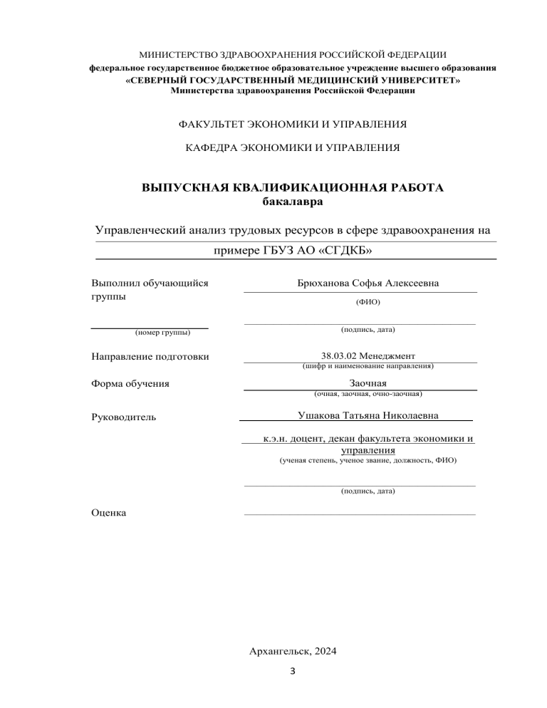 МИНИСТЕРСТВО ЗДРАВООХРАНЕНИЯ РОССИЙСКОЙ ФЕДЕРАЦИИ федеральное государственное бюджетное образовательное учреждение высшего образования «СЕВЕРНЫЙ ГОСУДАРСТВЕННЫЙ МЕДИЦИНСКИЙ УНИВЕРСИТЕТ» Министерства здравоохранения Российской Федерации ФАКУЛЬТЕТ ЭКОНОМИКИ И УПРАВЛЕНИЯ КАФЕДРА ЭКОНОМИКИ И УПРАВЛЕНИЯ ВЫПУСКНАЯ КВАЛИФИКАЦИОННАЯ РАБОТА бакалавра Управленческий анализ трудовых ресурсов в сфере здравоохранения на примере ГБУЗ АО «СГДКБ» Брюханова Софья Алексеевна Выполнил обучающийся группы (номер группы) (ФИО) ________________________________________________________ (подпись, дата) 38.03.02 Менеджмент Направление подготовки (шифр и наименование направления) Заочная Форма обучения (очная, заочная, очно-заочная) Ушакова Татьяна Николаевна Руководитель к.э.н. доцент, декан факультета экономики и управления (ученая степень, ученое звание, должность, ФИО) ________________________________________________________ (подпись, дата) Оценка ________________________________________________________ Архангельск, 2024 3 МИНИСТЕРСТВО ЗДРАВООХРАНЕНИЯ РОССИЙСКОЙ ФЕДЕРАЦИИ федеральное государственное бюджетное образовательное учреждение высшего образования «СЕВЕРНЫЙ ГОСУДАРСТВЕННЫЙ МЕДИЦИНСКИЙ УНИВЕРСИТЕТ» Министерства здравоохранения Российской Федерации КАФЕДРА ЭКОНОМИКИ И УПРАВЛЕНИЯ «УТВЕРЖДАЮ» «____»__________________20____г. Зав. кафедрой __________________ Задание по выпускной квалификационной работе обучающегося Брюхановой Софьи Алексеевны (фамилия, имя, отчество) 1.Тема работы Управленческий анализ трудовых ресурсов в сфере здравоохранения на примере ГБУЗ АО «СГДКБ» 2. Срок сдачи обучающимся законченной работы «06» апреля 2024 г. 3. План выпускной квалификационной работы: Введение Гл. 1 Теоретические и методологические основы исследования состояния и использования трудовых ресурсов в сфере здравоохранения Гл. 2 Анализ состояния и использования трудовых ресурсов ГБУЗ АО «СГДКБ» Гл. 3 Рекомендации по совершенствованию использования трудовых ресурсов в ГБУЗ АО «СГДКБ» Заключение Список литературы 4. График выполнения выпускной квалификационной работы Сроки выполнения 1 Подбор литературы, ее изучение и обработка. Составление 25.09.2023 библиографии по основным источникам 31.10.2023 2 Разработка и представление на проверку первой главы ВКР 01.11.2023 28.01.2024 3 Накопление, систематизация, анализ практических 29.01.2024 – материалов 07.03.2024 4 Разработка и представление на проверку второй главы 29.01.2024 – 07.03.2024 5 Разработка и представление на проверку третьей главы 07.03.2024 – 24.03.2024 6. Переработка (доработка) ВКР в соответствии с замечаниями и 25.03.2024 представление ее на кафедру 06.04.2024 7 Разработка тезисов доклада для защиты 07.04.2024 – 10.04.2024 8 Ознакомление с отзывом руководителя 11.04.2024 9 Завершение подготовки к защите с учетом отзыва 11.04.2024 – Мероприятия 4 Отметка о выполнении выполнено выполнено выполнено выполнено выполнено выполнено выполнено выполнено выполнено руководителя 15.04.2024 Обучающийся ___________________________________________ (подпись) 5 СОДЕРЖАНИЕ ВВЕДЕНИЕ .......................................................................................................... 7 1 ТЕОРЕТИЧЕСКИЕ И МЕТОДОЛОГИЧЕСКИЕ ОСНОВЫ ИССЛЕДОВАНИЯ СОСТОЯНИЯ И ИСПОЛЬЗОВАНИЯ ТРУДОВЫХ РЕСУРСОВ В СФЕРЕ ЗДРАВООХРАНЕНИЯ ............................................... 10 1.1 Трудовые ресурсы, их роль и значение в сфере здравоохранения .. 10 1.2 Методы оценки и анализа трудовых ресурсов .................................. 14 1.3 Проблемы обеспеченности российского здравоохранения трудов