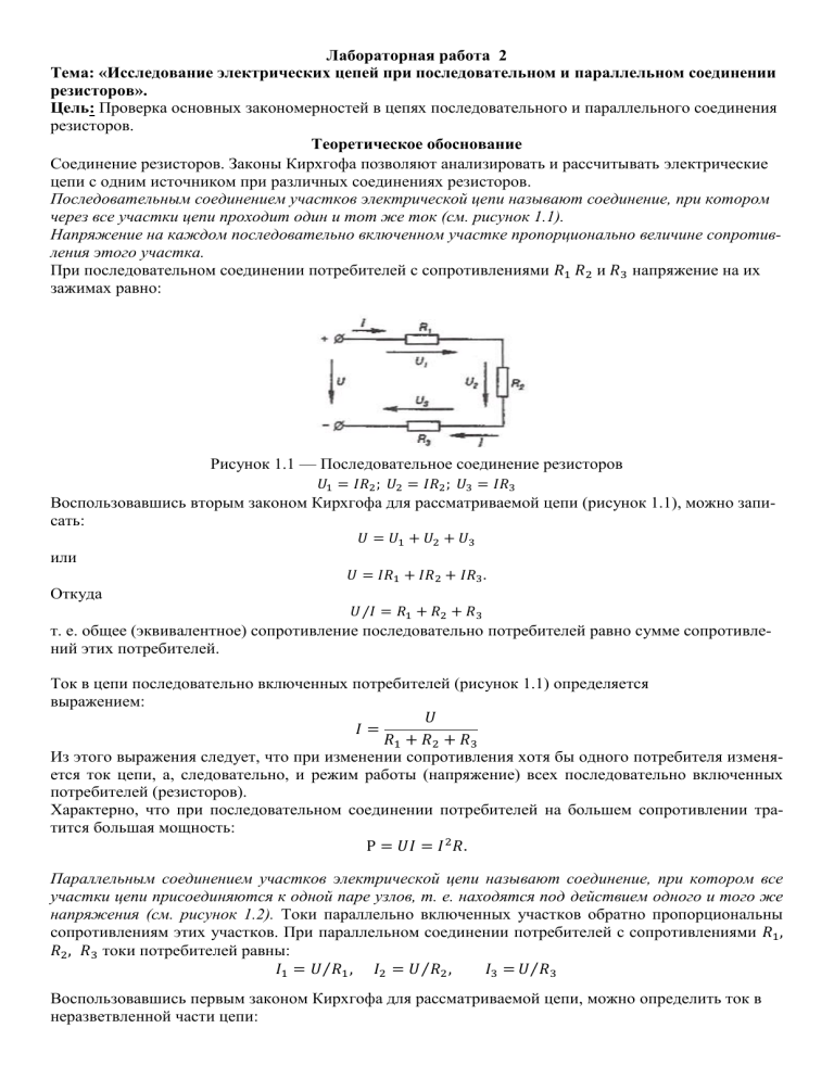 Лабораторная работа 2 Тема: «Исследование электрических цепей при последовательном и параллельном соединении резисторов». Цель: Проверка основных закономерностей в цепях последовательного и параллельного соединения резисторов. Теоретическое обоснование Соединение резисторов. Законы Кирхгофа позволяют анализировать и рассчитывать электрические цепи с одним источником при различных соединениях резисторов. Последовательным соединением участков электрической цепи называют соединение, при котором через все участки цепи проходит один и тот же ток (см. рисунок 1.1). Напряжение на каждом последовательно включенном участке пропорционально величине сопротивления этого участка. При последовательном соединении потребителей с сопротивлениями 𝑅1 𝑅2 и 𝑅3 напряжение на их зажимах равно: Рисунок 1.1 — Последовательное соединение резисторов 𝑈1 = 𝐼𝑅2 ; 𝑈2 = 𝐼𝑅2 ; 𝑈3 = 𝐼𝑅3 Воспользовавшись вторым законом Кирхгофа для рассматриваемой цепи (рисунок 1.1), можно записать: 𝑈 = 𝑈1 + 𝑈2 + 𝑈3 или 𝑈 = 𝐼𝑅1 + 𝐼𝑅2 + 𝐼𝑅3 . Откуда 𝑈⁄𝐼 = 𝑅1 + 𝑅2 + 𝑅3 т. е. общее (эквивалентное) сопротивление последовательно потребителей равно сумме сопротивлений этих потребителей. Ток в цепи последовательно включенных потребителей (рисунок 1.1) определяется выражением: 𝑈 𝐼= 𝑅1 + 𝑅2 + 𝑅3 Из этого выражения следует, что при изменении сопротивления хотя бы одного потребителя изменяется ток цепи, а, следовательно, и режим работы (напряжение) всех последовательно включенных потребителей (резисторов). Характерно, что при последовательном соединении потребителей на большем сопротивлении тратится большая мощность: Р = 𝑈𝐼 = 𝐼 2 𝑅. Параллельным соединением участков электрической цепи называют соединение, при котором все участки цепи присоединяются к одной паре узлов, т. е. находятся под действием одного и того же напряжения (см. рисунок 1.2). Токи параллельно включенных участков обратно пропорциональны сопротивлениям этих участков. При параллельном соединении потребителей с сопротивлениями 𝑅1 , 𝑅2 , 𝑅3 токи потребителей равны: 𝐼1 = 𝑈⁄𝑅1 , 𝐼2 = 𝑈⁄𝑅2 , 𝐼3 = 𝑈⁄𝑅3 Воспользовавшись первым законом Кирхгофа для рассматриваемой цепи, можно определить ток в неразветвленной части цепи: или 𝐼 = 𝐼1 + 𝐼2 + 𝐼3 𝐼 = 𝑈⁄𝑅1 = 𝑈⁄𝑅2 = 𝑈⁄𝑅3 = 𝑈(𝐼 ⁄𝑅1 + 𝐼 ⁄𝑅2 + 𝐼 ⁄𝑅3 ) 𝐼 ⁄𝑈 = 𝐼 ⁄𝑅1 + 𝐼 ⁄𝑅2 + 𝐼 ⁄𝑅3 = 𝐼 ⁄𝑅 Рисунок 1.2 — Параллельное соединение резисторов Т. е. обратная величина общего (эквивалентного) сопротивления (R) параллельно включенных потребителей равна сумме обратных величин сопротивлений этих потребителей. Величина, обратная сопротивлению, определяет проводимость потребителя (g). Общая (эквивалентная) проводимость цепи при параллельном соединении потребителей определяется выражением: g = g1 +g 2 + g 3 Если параллельно включены п одинаковых потребителей с cпротивлением 𝑅 ′ каждое, то эквивалентное сопротивление этих потребителей 𝑅 = 𝑅′/𝑛. Если параллельно включены два потребителя с сопротивлениями 𝑅1 и 𝑅2 , то общее (эквивалентное) их сопротивление по (9): 𝑅1 ∙ 𝑅2 𝑅12 = 𝑅1 + 𝑅2 Изменение сопротивления какого-либо из параллельно соединенных потребителей не влияет на режим работы (напряжение) всех потребителей, включая изменяемый. Поэтому параллельное соединение потребителей нашло широкое практическое применение. При параллельном соединении потребителей н