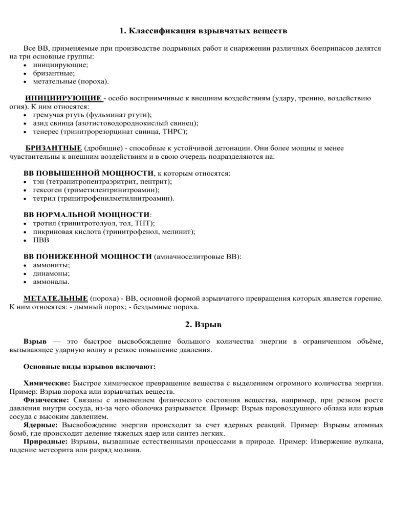 Классификация взрывчатых веществ, виды взрывов и свойства ВВ
