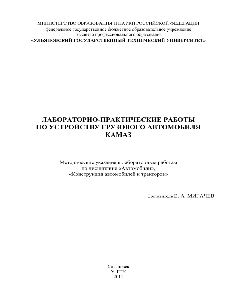 МИНИСТЕРСТВО ОБРАЗОВАНИЯ И НАУКИ РОССИЙСКОЙ ФЕДЕРАЦИИ федеральное государственное бюджетное образовательное учреждение высшего профессионального образования «УЛЬЯНОВСКИЙ ГОСУДАРСТВЕННЫЙ ТЕХНИЧЕСКИЙ УНИВЕРСИТЕТ» ЛАБОРАТОРНО-ПРАКТИЧЕСКИЕ РАБОТЫ ПО УСТРОЙСТВУ ГРУЗОВОГО АВТОМОБИЛЯ КАМАЗ Методические указания к лабораторным работам по дисциплине «Автомобили», «Конструкции автомобилей и тракторов» Составитель В. А. МИГАЧЕВ Ульяновск УлГТУ 2011 УДК 629.3.083 (076) ББК 39.33-08я7 Л 12 Рецензент канд. техн. наук, доцент Обшивалкин М. Ю. Одобрено секцией методических пособий научно-методического совета УлГТУ Лабораторно-практические работы по устройству грузового автомобиЛ 12 ля КАМАЗ : методические указания к лабораторным работам по дисциплинам «Автомобили», «Конструкции автомобилей и тракторов» / составитель В. А. Мигачев. – Ульяновск : УлГТУ, 2011. – 64 с. Составлены в соответствии с типовой программой дисциплин «Автомобили» и «Конструкции автомобилей и тракторов». Предназначены для подготовки и выполнения лабораторных работ студентами всех форм обучения специальностей 190601.65 и «Автомобили и автомобильное хозяйство», 190201.65 «Автомобиле- и тракторостроение», а также для направлений подготовки 190600.62 «Эксплуатация транспортно-технологических машин и комплексов» (профиль «Автомобили и автомобильное хозяйство») и 190100.62 «Наземные транспортнотехнологические комплексы» (профиль «Автомобиле- и тракторостроение»). Работа выполнена на кафедре «Автомобили». УДК 629.3.083 (076) ББК 39.33-08я7 © Мигачев В. А., 2011. © Оформление. УлГТУ, 2011. 2 СОДЕРЖАНИЕ ВВЕДЕНИЕ…………………………………………………………………….. 4 ИНСТРУКЦИЯ ПО ОХРАНЕ ТРУДА ПРИ ПРОВЕДЕНИИ ЛАБОРАТОРНО-ПРАКТИЧЕСКНХ ЗАНЯТИЙ 6 1. ДВИГАТЕЛЬ КАМАЗ-740………………………….……………………... Задание 1. Тема «Кривошипно-шатунный и газораспределительный механизмы двигателя»……………………………………….……….……….. Контрольные вопросы к заданию 1…………………………………………… Инструкционно-технологическая карта № 1………………………………… Задание 2. Тема «Система охлаждения и смазочная система двигателя»….. Контрольные вопросы к заданию 2…………………………………………… Инструкционно-технологическая карта № 2………………………………… Инструкционно-технологическая карта № 3………………………………… Задание 3. Тема «Дизельная система питания двигателя»………………….. Контрольные вопросы к заданию 3…………………………………………… Инструкционно-технологическая карта № 4………………………………… 7 7 11 11 14 18 19 20 23 24 27 2. ТРАНСМИССИЯ……………………………………………………..……. Задание 4. Тема «Трансмиссия автомобиля КАМАЗ-5320»……………….... Контрольные вопросы к заданию 4…………………………………………… Инструкционно-технологическая карта № 5………………………………… Инструкционно-технологическая карта № 6………………………………… 29 29 37 38 39 3. ХОДОВАЯ ЧАСТЬ………………………………………………………… Задание 5. Тема «Ходовая часть автомобиля КАМАЗ-5320»……………….. Контрольные вопросы к заданию 5…………………………………………… Инструкционно-технологическая карта № 7………………………………… Инструкционно-технологическая карта № 8………………………………… 43 43 48 48 49 4. РУЛЕВОЕ УПРАВЛЕНИЕ………………………………………………. Задание 6. Тема «Рулевое управление автомобиля КАМАЗ-5320»………. Контрольные вопросы к заданию 6…………………………………………… Инструкционно-технологическая карта № 9………………………………… 52