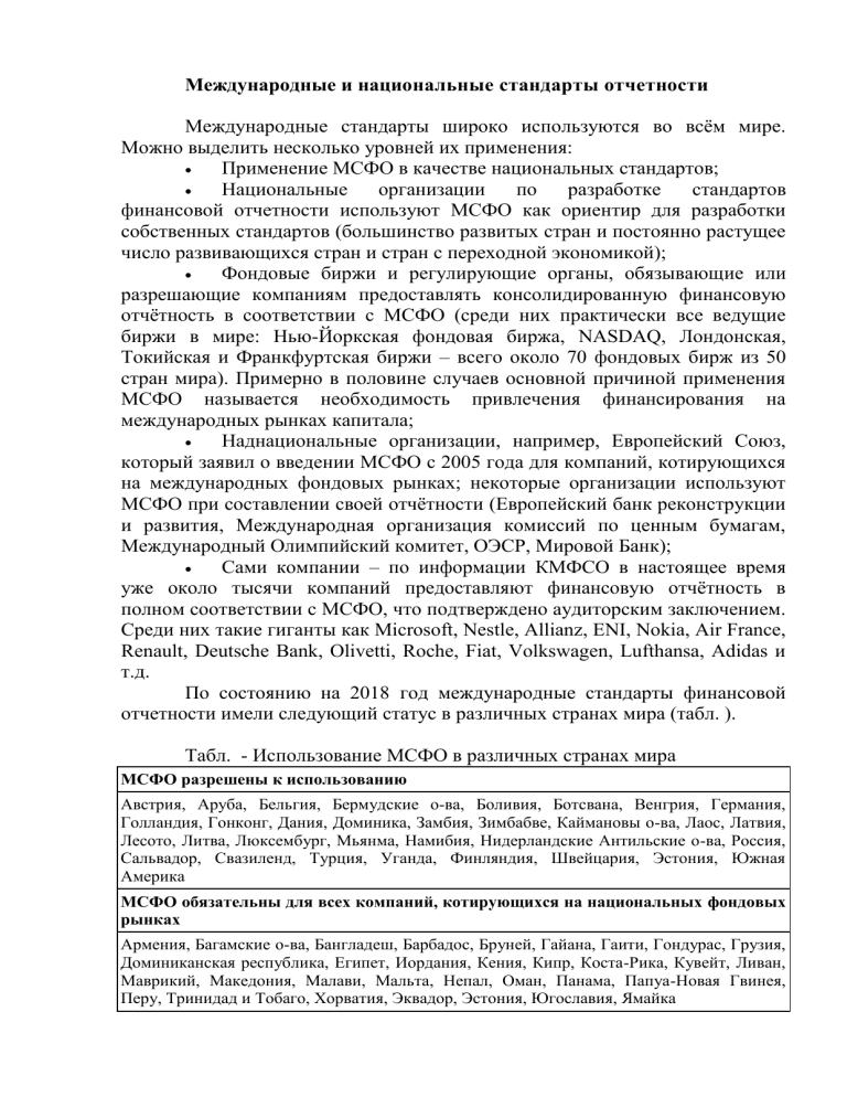 Международные и национальные стандарты отчетности Международные стандарты широко используются во всём мире. Можно выделить несколько уровней их применения: Применение МСФО в качестве национальных стандартов; Национальные организации по разработке стандартов финансовой отчетности используют МСФО как ориентир для разработки собственных стандартов (большинство развитых стран и постоянно растущее число развивающихся стран и стран с переходной экономикой); Фондовые биржи и регулирующие органы, обязывающие или разрешающие компаниям предоставлять консолидированную финансовую отчётность в соответствии с МСФО (среди них практически все ведущие биржи в мире: Нью-Йоркская фондовая биржа, NASDAQ, Лондонская, Токийская и Франкфуртская биржи – всего около 70 фондовых бирж из 50 стран мира). Примерно в половине случаев основной причиной применения МСФО называется необходимость привлечения финансирования на международных рынках капитала; Наднациональные организации, например, Европейский Союз, который заявил о введении МСФО с 2005 года для компаний, котирующихся на международных фондовых рынках; некоторые организации используют МСФО при составлении своей отчётности (Европейский банк реконструкции и развития, Международная организация комиссий по ценным бумагам, Международный Олимпийский комитет, ОЭСР, Мировой Банк); Сами компании – по информации КМФСО в настоящее время уже около тысячи компаний предоставляют финансовую отчётность в полном соответствии с МСФО, что подтверждено аудиторским заключением. Среди них такие гиганты как Microsoft, Nestle, Allianz, ENI, Nokia, Air France, Renault, Deutsche Bank, Olivetti, Roche, Fiat, Volkswagen, Lufthansa, Adidas и т.д. По состоянию на 2018 год международные стандарты финансовой отчетности имели следующий статус в различных странах мира (табл. ). Табл. - Использование МСФО в различных странах мира МСФО разрешены к использованию Австрия, Аруба, Бельгия, Бермудские о-ва, Боливия, Ботсвана, Венгрия, Германия, Голландия, Гонконг, Дания, Доминика, Замбия, Зимбабве, Каймановы о-ва, Лаос, Латвия, Лесото, Литва, Люксембург, Мьянма, Намибия, Нидерландские Антильские о-ва, Россия, Сальвадор, Свазиленд, Турция, Уганда, Финляндия, Швейцария, Эстония, Южная Америка МСФО обязательны для всех компаний, котирующихся на национальных фондовых рынках Армения, Багамские о-ва, Бангладеш, Барбадос, Бруней, Гайана, Гаити, Гондурас, Грузия, Доминиканская республика, Египет, Иордания, Кения, Кипр, Коста-Рика, Кувейт, Ливан, Маврикий, Македония, Малави, Мальта, Непал, Оман, Панама, Папуа-Новая Гвинея, Перу, Тринидад и Тобаго, Хорватия, Эквадор, Эстония, Югославия, Ямайка МСФО обязательны для некоторых компаний, котирующихся на национальных фондовых рынках Бахрейн (для банков), Венгрия, Китай, ОАЭ (для банков), Румыния (для стратегических компаний, с 2005 для всех крупных компаний), Украина (для банков) МСФО планируются с 2003 для всех компаний, котирующихся на национальных фондовых рынках Болгария, Греция, Кыргызстан, Таджикистан, Украина МСФО планируются с 2004 для всех компаний, котирующихся на национальных фондовых рынках Россия, Танзания МСФО планируются с 2005 для всех компаний, котирующихся на национальных фондовых рынках Австралия, Австрия, Бельгия, Великобритания, Германия, Голландия, Дания, Ирландия, Исландия, Испания, Италия, Лихтенштейн, Люксембург, Норвегия, Португалия, Швеция,