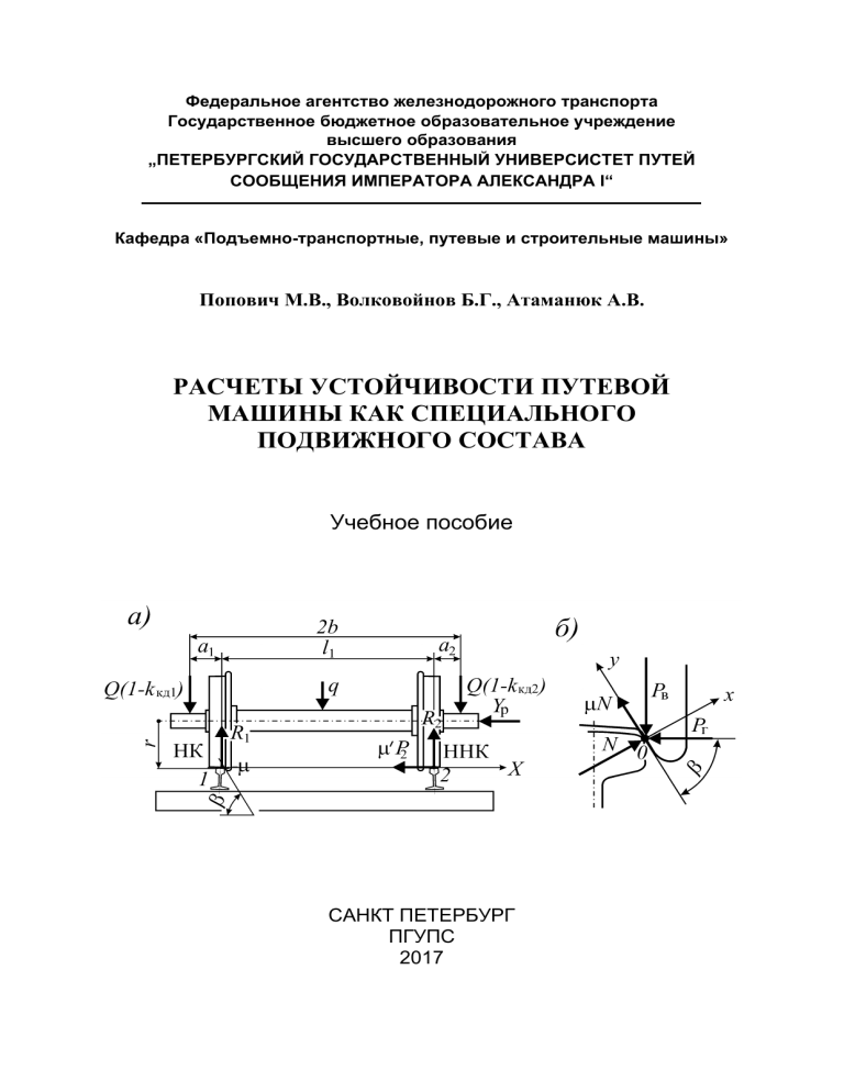Федеральное агентство железнодорожного транспорта Государственное бюджетное образовательное учреждение высшего образования „ПЕТЕРБУРГСКИЙ ГОСУДАРСТВЕННЫЙ УНИВЕРСИСТЕТ ПУТЕЙ СООБЩЕНИЯ ИМПЕРАТОРА АЛЕКСАНДРА I“ Кафедра «Подъемно-транспортные, путевые и строительные машины» Попович М.В., Волковойнов Б.Г., Атаманюк А.В. РАСЧЕТЫ УСТОЙЧИВОСТИ ПУТЕВОЙ МАШИНЫ КАК СПЕЦИАЛЬНОГО ПОДВИЖНОГО СОСТАВА Учебное пособие САНКТ ПЕТЕРБУРГ ПГУПС 2017 Федеральное агентство железнодорожного транспорта Государственное бюджетное образовательное учреждение высшего образования „ПЕТЕРБУРГСКИЙ ГОСУДАРСТВЕННЫЙ УНИВЕРСИСТЕТ ПУТЕЙ СООБЩЕНИЯ ИМПЕРАТОРА АЛЕКСАНДРА I“ Кафедра «Подъемно-транспортные, путевые и строительные машины» Попович М.В., Волковойнов Б.Г., Атаманюк А.В. РАСЧЕТЫ УСТОЙЧИВОСТИ ПУТЕВОЙ МАШИНЫ КАК СПЕЦИАЛЬНОГО ПОДВИЖНОГО СОСТАВА Учебное пособие Санкт-Петербург ПГУПС 2017 УДК 625.173 ББК 0211 П58 Р е ц е н з е н т ы: Главный инженер Дирекции по эксплуатации и ремонту путевых машин Октябрьской дирекции инфраструктуры – структурного подразделения Центральной дирекции инфраструктуры И.В.Шумилин; Заведующий кафедрой «Автоматизированное проектирование» факультета «Автоматизация и интеллектуальные технологии» ПГУПСа, канд.техн.наук, доцент Я.С.Ватулин П Попович М.В., Волковойнов Б.Г., Атаманюк А.В. Расчеты устойчивости путевой машины как специального подвижного состава: учеб. пособие, под ред. М.В. Поповича – СПб.: Петербургский государственный университет путей сообщения императора Александра I, 2017. 48 с. ISBN В пособии приведены стандартные методики расчета устойчивости путевой машины как специального подвижного состава против опрокидывания и вкатывания гребня на головку рельса. Материалы предназначены для использования при выполнении курсового проекта по дисциплине «Путевые машины» студентами всех форм обучения специальности 23.05.01 (190109.65) «Наземные транспортнотехнологические средства», специализация «Подъемно-транспортные, строительные, дорожные машины и оборудование УДК 625.173 ББК 0211 ISBN ©Попович М.В., Волковойнов Б.Г., Атаманюк А.В., 2017 ©Петербургский государственный университет путей сообщения императора Александра I Введение Кафедра «Подъемно-транспортные, путевые и строительные машины» ПГУПСа ведет подготовку инженеров по специальности 23.05.01. (190109.65) «Наземные транспортно-технологические средства» специализации «Подъемно-транспортные, строительные, дорожные машины и оборудование», для работы в инфраструктуре ОАО «РЖД», в путевом комплексе. Учебная дисциплина «Путевые машины» является профилирующей и относится к обязательным дисциплинам учебного процесса. Работа над курсовым или дипломным проектом, как важным средством формирования инженера, предусматривает освоение методов расчета путевой машины, которые гарантируют ее нормальную эксплуатацию на сети ОАО «РЖД», промышленного и городского транспорта. По условиям безопасности машина должна иметь необходимый запас устойчивости при стоянке и в движении, то есть противостоять действующим на нее нагрузкам, стремящимся привести к ее продольному, поперечному опрокидыванию, или к вкатыванию колеса на головку рельса. Устойчивость путевой машины – это способность противостоять внешним силам, стремящимся отклонить ее от заданного направления движения и привести к вкатыв
