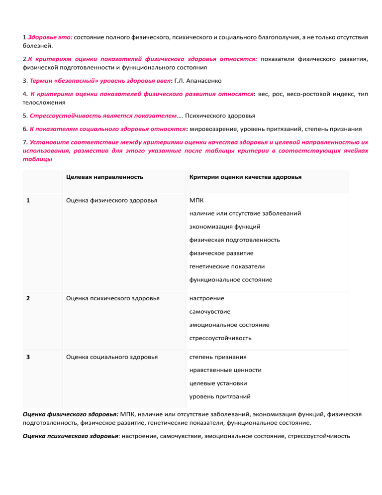 1.Здоровье это: состояние полного физического, психического и социального благополучия, а не только отсутствия болезней. 2.К критериям оценки показателей физического здоровья относятся: показатели физического развития, физической подготовленности и функционального состояния 3. Термин «безопасный» уровень здоровья ввел: Г.Л. Апанасенко 4. К критериям оценки показателей физического развития относятся: вес, рос, весо-ростовой индекс, тип телосложения 5. Стрессоустойчивость является показателем…. Психического здоровья 6. К показателям социального здоровья относятся: мировоззрение, уровень притязаний, степень признания 7. Установите соответствие между критериями оценки качества здоровья и целевой направленностью их использования, разместив для этого указанные после таблицы критерии в соответствующих ячейках таблицы 1 Целевая направленность Критерии оценки качества здоровья Оценка физического здоровья МПК наличие или отсутствие заболеваний экономизация функций физическая подготовленность физическое развитие генетические показатели функциональное состояние 2 Оценка психического здоровья настроение самочувствие эмоциональное состояние стрессоустойчивость 3 Оценка социального здоровья степень признания нравственные ценности целевые установки уровень притязаний Оценка физического здоровья: МПК, наличие или отсутствие заболеваний, экономизация функций, физическая подготовленность, физическое развитие, генетические показатели, функциональное состояние. Оценка психического здоровья: настроение, самочувствие, эмоциональное состояние, стрессоустойчивость Оценка социального здоровья: степень признания, нравственные ценности, целевые установки, уровень притязаний 8. Установите соответствие между критериями оценки физического здоровья и конкретными показателями физического здоровья, разместив указанные после таблицы показатели в соответствующих ячейках таблицы 1 Критерии оценки физического здоровья Показатели физического здоровья Физическое развитие весо-ростовой индекс вес 2 Физическая подготовленность сила кисти становая сила выносливость координационные способности 3 Функциональное состояние количество воды в организме электрокардиограмма артериальное давление пробы с задержкой дыхания ЧСС в покое и после нагрузки 12-минутный тест Купера Физическое развитие: весо-ростовой индекс, вес Физическая подготовленность: сила кисти, становая сила, выносливость, координационные способности. Функциональное состояние: количество воды в организме, электрокардиограмма, артериальное давление пробы с задержкой дыхания, ЧСС в покое и после нагрузки, 12-минутный тест Купера. 9. Методика БОС (биологически обратная связь) основана на: использовании компьютерных игр. 10. По данным арктического института, установлено изменяющихся сезонных периодов (биологических ритмов): 8 11. При проектировании здоровьесберегающей технологии прежде всего необходимо учитывать: имеющиеся отклонения в состоянии здоровья, пол и возраст 12. Термин «здоровьеформирующие технологии» ввел: Бальсевич В.К. 13.Кондиционирование осуществляется с целью: закаливания организма 14. Здоровьесберегающие технологии чаще всего включают в себя: дыхательную гимнастику, асаныхатха-йоги, закаливание 15. Укажите правильную последовательность этапов про