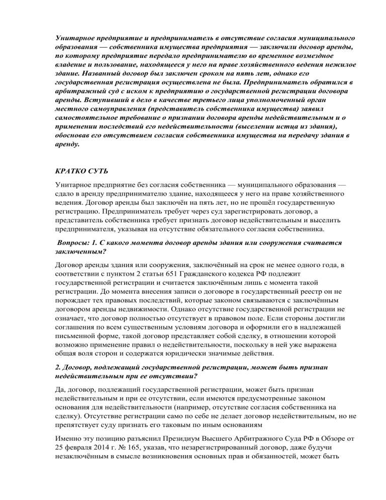 Унитарное предприятие и предприниматель в отсутствие согласия муниципального образования — собственника имущества предприятия — заключили договор аренды, по которому предприятие передало предпринимателю во временное возмездное владение и пользование, находящееся у него на праве хозяйственного ведения нежилое здание. Названный договор был заключен сроком на пять лет, однако его государственная регистрация осуществлена не была. Предприниматель обратился в арбитражный суд с иском к предприятию о государственной регистрации договора аренды. Вступивший в дело в качестве третьего лица уполномоченный орган местного самоуправления (представитель собственника имущества) заявил самостоятельное требование о признании договора аренды недействительным и о применении последствий его недействительности (выселении истца из здания), обосновав его отсутствием согласия собственника имущества на передачу здания в аренду. КРАТКО СУТЬ Унитарное предприятие без согласия собственника — муниципального образования — сдало в аренду предпринимателю здание, находящееся у него на праве хозяйственного ведения. Договор аренды был заключён на пять лет, но не прошёл государственную регистрацию. Предприниматель требует через суд зарегистрировать договор, а представитель собственника требует признать договор недействительным и выселить предпринимателя, указывая на отсутствие обязательного согласия собственника. Вопросы: 1. С какого момента договор аренды здания или сооружения считается заключенным? Договор аренды здания или сооружения, заключённый на срок не менее одного года, в соответствии с пунктом 2 статьи 651 Гражданского кодекса РФ подлежит государственной регистрации и считается заключённым лишь с момента такой регистрации. До момента внесения записи о договоре в государственный реестр он не порождает тех правовых последствий, которые законом связываются с заключённым договором аренды недвижимости. Однако отсутствие государственной регистрации не означает, что договор полностью отсутствует в правовом поле. Если стороны достигли соглашения по всем существенным условиям договора и оформили его в надлежащей письменной форме, такой договор представляет собой сделку, в отношении которой возможно применение правил о недействительности, поскольку в ней уже выражена общая воля сторон и содержатся юридически значимые действия. 2. Договор, подлежащий государственной регистрации, может быть признан недействительным при ее отсутствии? Да, договор, подлежащий государственной регистрации, может быть признан недействительным и при ее отсутствии, если имеются предусмотренные законом основания для недействительности (например, отсутствие согласия собственника на сделку). Отсутствие регистрации само по себе не делает договор недействительным, но не препятствует суду признать его таковым по иным основаниям Именно эту позицию разъяснил Президиум Высшего Арбитражного Суда РФ в Обзоре от 25 февраля 2014 г. № 165, указав, что незарегистрированный договор, даже будучи незаключённым в смысле возникновения основных прав и обязанностей, может быть оспорен и признан недействительным. Регистрация влияет лишь на возникновение последствий, связанных с переходом прав и обязанностей по договору, а также на его действие в отношении треть
