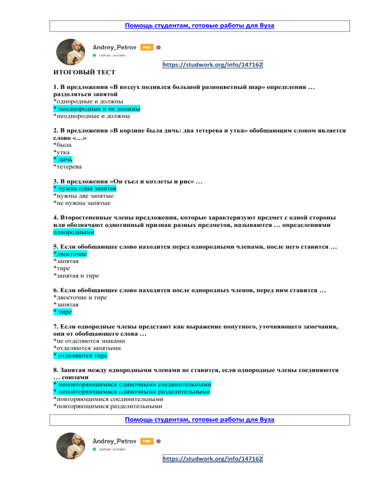 Помощь студентам, готовые работы для Вуза https://studwork.org/info/147162 ИТОГОВЫЙ ТЕСТ 1. В предложении «В воздух поднялся большой разноцветный шар» определения … разделяться запятой *однородные и должны * неоднородные и не должны *неоднородные и должны 2. В предложении «В корзине была дичь: два тетерева и утка» обобщающим словом является слово «…» *была *утка * дичь *тетерева 3. В предложении «Он съел и котлеты и рис» … * нужна одна запятая *нужны две запятые *не нужны запятые 4. Второстепенные члены предложения, которые характеризуют предмет с одной стороны или обозначают однотипный признак разных предметов, называются … определениями однородными 5. Если обобщающее слово находится перед однородными членами, после него ставится … *двоеточие *запятая *тире *запятая и тире 6. Если обобщающее слово находится после однородных членов, перед ним ставится … *двоеточие и тире *запятая * тире 7. Если однородные члены предстают как выражение попутного, уточняющего замечания, они от обобщающего слова … *не отделяются знаками *отделяются запятыми * отделяются тире 8. Запятая между однородными членами не ставится, если однородные члены соединяются … союзами * неповторяющимися одиночными соединительными * неповторяющимися одиночными разделительными *повторяющимися соединительными *повторяющимися разделительными Помощь студентам, готовые работы для Вуза https://studwork.org/info/147162 Помощь студентам, готовые работы для Вуза https://studwork.org/info/147162 9. К признакам однородности определений относятся … * обозначение взаимозависимых в условиях контекста признаков * характеристика предмета с одной стороны *расположение перед определяемым словом 10. Между однородными членами предложения – … * сочинительная связь *подчинительная связь *отношения целого и части 11. Между однородными членами предложения (или их группами) может ставиться точка с запятой, если … *однородные члены противоположны по смыслу * в их состав включаются вводные слова *однородные члены выражены разными частями речи * однородные члены являются распространенными 12. Между однородными членами предложения ставится тире, если … * пропущен противительный союз *пропущен соединительный союз * есть союз, обозначающий резкую смену чего-либо *есть противительный союз 13. Неверно, что однородными членами являются … *слова, связанные соединительным союзом, типа «жара и холод» * повторяющиеся слова типа «еду, еду …» * фразеологизмы типа «ни свет ни заря» *слова, связанные противительным союзом, типа «сильно, но аккуратно» 14. Неоднородными являются определения, если они выражены … * числительным и прилагательным * местоимением и прилагательным *качественными прилагательными 15. Несогласованные определения обычно являются … * однородными *неоднородными *однородными только в ряду согласованных определений 16. Однородные члены могут быть связаны такими союзами, как … * или *что * ни … ни * не только … но и Помощь студентам, готовые работы для Вуза https://studwork.org/info/147162 Помощь студентам, готовые работы для Вуза https://studwork.org/info/147162 17. Однородные члены предложения, соединенные повторяющимися союзами, как правило, … * разделяются запятыми *не разделяются знаками препинания *разделяются тире 18. Определения, характеризующие предмет с разных сторон, не связанные сочинительной связью и интонацией перечисления, называются … определ