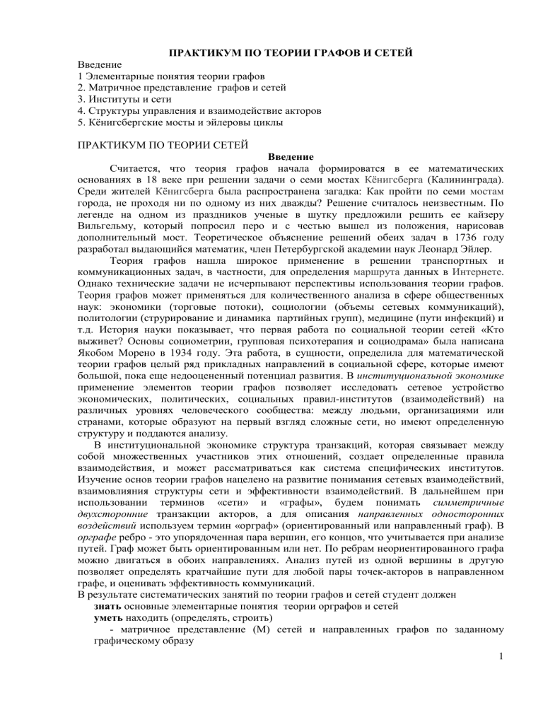 ПРАКТИКУМ ПО ТЕОРИИ ГРАФОВ И СЕТЕЙ Введение 1 Элементарные понятия теории графов 2. Матричное представление графов и сетей 3. Институты и сети 4. Структуры управления и взаимодействие акторов 5. Кёнигсбергские мосты и эйлеровы циклы ПРАКТИКУМ ПО ТЕОРИИ СЕТЕЙ Введение Считается, что теория графов начала формироватся в ее математических основаниях в 18 веке при решении задачи о семи мостах Кёнигсберга (Калининграда). Cреди жителей Кёнигсберга была распространена загадка: Как пройти по семи мостам города, не проходя ни по одному из них дважды? Решение считалось неизвестным. По легенде на одном из праздников ученые в шутку предложили решить ее кайзеру Вильгельму, который попросил перо и с честью вышел из положения, нарисовав дополнительный мост. Теоретическое объяснение решений обеих задач в 1736 году разработал выдающийся математик, член Петербургской академии наук Леонард Эйлер. Теория графов нашла широкое применение в решении транспортных и коммуникационных задач, в частности, для определения маршрута данных в Интернете. Однако технические задачи не исчерпывают перспективы использования теории графов. Теория графов может применяться для количественного анализа в сфере общественных наук: экономики (торговые потоки), социологии (объемы сетевых коммуникаций), политологии (струрирование и динамика партийных групп), медицине (пути инфекций) и т.д. История науки показывает, что первая работа по социальной теории сетей «Кто выживет? Основы социометрии, групповая психотерапия и социодрама» была написана Якобом Морено в 1934 году. Эта работа, в сущности, определила для математической теории графов целый ряд прикладных направлений в социальной сфере, которые имеют большой, пока еще недооцененный потенциал развития. В институциональной экономике применение элементов теории графов позволяет исследовать сетевое устройство экономических, политических, социальных правил-институтов (взаимодействий) на различных уровнях человеческого сообщества: между людьми, организациями или странами, которые образуют на первый взгляд сложные сети, но имеют определенную структуру и поддаются анализу. В институциональной экономике структура транзакций, которая связывает между собой множественных участников этих отношений, создает определенные правила взаимодействия, и может рассматриваться как система специфических институтов. Изучение основ теории графов нацелено на развитие понимания сетевых взаимодействий, взаимовлияния структуры сети и эффективности взаимодействий. В дальнейшем при использовании терминов «сети» и «графы», будем понимать симметричные двухсторонние транзакции акторов, а для описания направленных односторонних воздействий используем термин «орграф» (ориентированный или направленный граф). В орграфе ребро - это упорядоченная пара вершин, его концов, что учитывается при анализе путей. Граф может быть ориентированным или нет. По ребрам неориентированного графа можно двигаться в обоих направлениях. Анализ путей из одной вершины в другую позволяет определять кратчайшие пути для любой пары точек-акторов в направленном графе, и оценивать эффективность коммуникаций. В результате систематических занятий по теории графов и сетей студент должен знать основные элементарные понятия теории орграфов и сетей уметь находить 