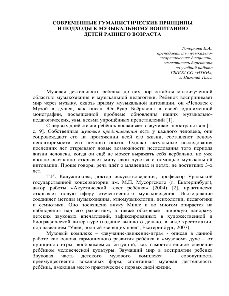 СОВРЕМЕННЫЕ ГУМАНИСТИЧЕСКИЕ ПРИНЦИПЫ И ПОДХОДЫ К МУЗЫКАЛЬНОМУ ВОПИТАНИЮ ДЕТЕЙ РАННЕГО ВОЗРАСТА Топоркова Е.А., преподаватель музыкальнотеоретичесикх дисциплин, заместитель директора по учебной работе ГБПОУ СО «НТКИ», г. Нижний Тагил Музовая деятельность ребенка до сих пор остаётся малоизученной областью музыкознания и музыкальной педагогики. Ребенок воспринимает мир через музыку, сквозь призму музыкальной интонации, он «Человек с Музой в душе», как писал Юн-Руар Бьёркволл в своей одноименной монографии, посвященной проблеме обновления наших музыкальнопедагогических, увы, весьма упрощённых представлений [1]. С первых дней жизни ребёнок «осваивает-озвучивает пространство» [1, с. 9]. Собственные музовые представления есть у каждого человека, они сопровождают его на протяжении всей его жизни, составляют основу неповторимости его личного опыта. Однако актуальные исследования последних лет открывают новые возможности исследования того периода жизни человека, когда он ещё не может выражать себя вербально, но уже вполне осознанно открывает миру свои чувства с помощью музыкальной интонации. Проще говоря, речь идёт о младенцах и детях, не достигших 3-х лет. Т.И. Калужникова, доктор искусствоведения, профессор Уральской государственной консерватории им. М.П. Мусоргского (г. Екатеринбург), автор работы «Акустический текст ребёнка» (2004) [2], практически открывает новую сферу отечественного музыковедения. Исследование соединяет методы музыкознания, этномузыкологии, психологии, педагогики и семиотики. Оно посвящено внуку Мише и во многом опирается на наблюдения над его развитием, а также обозревает широкую панораму детских звуковых впечатлений, зафиксированных в художественной и биографической литературе (издание вышло отдельно, в виде хрестоматии, под названием "Улей, полный звенящих пчёл", Екатеринбург, 2007). Музовый комплекс – «звучание-движение-игра» - описан в данной работе как основа гармоничного развития ребёнка в «музовом» духе – от принципов игры, воображаемых ситуаций, как самостоятельное освоение ребёнком человеческой культуры. Звучащий мир в восприятии ребёнка Звуковая часть детского музового комплекса – совокупность преимущественно вокальных форм, спонтанная музовая деятельность ребёнка, имеющая место практически с первых дней жизни. Младенческие вокализации, младенческий «крик-плач» - определяется физиологическим состоянием малыша, это источник формирующейся речи, доречевая, довербальная форма коммуникации с матерью, он синкретичен по природе, так как объединяет речевые, музыкальные и кинетические элементы. «Крик-плач» - самое раннее проявление детской музовой активности. Постепенное расширение выразительности – в зависимости от ситуации, мать учится понимать эти крики «на музыкальном уровне», так как интонация на этом этапе выполняет смысловую функцию. Гуление и лепетание - следующий важный этап формирования и музыкальности ребёнка, и его речи. Лепет (англ., звукоподражательное babble, babbling, prattle) – формирование коммуникативной функции, подражание речевому и песенному интонированию взрослых. Игровые монологи появляются у ребёнка в возрасте около 3-х лет, они являются одним из видов «эгоцентрической речи» (термин Ж. Пиаже). Её признаки – внешнее звуковое проявление при внутренней коммуникативной функци