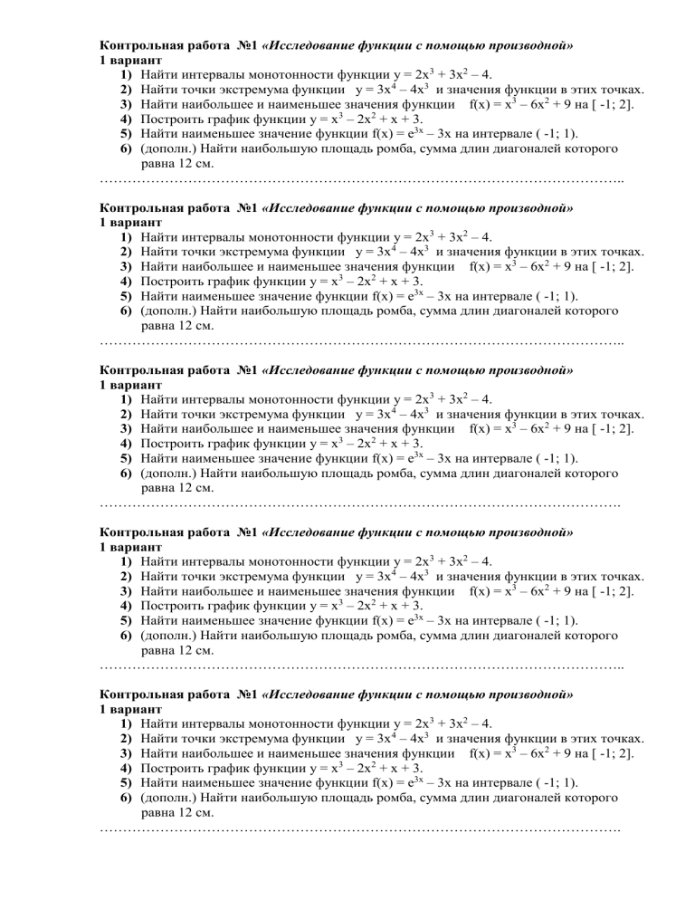 Контрольная работа №1 «Исследование функции с помощью производной»